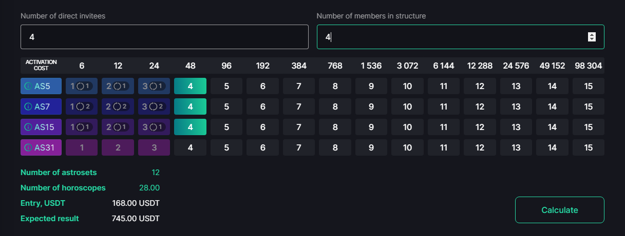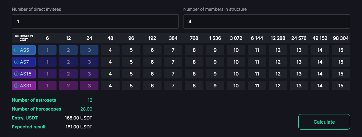 The calculator works by calculating the same amount of activations of astrosets by all specified partners of your structure. If your total activation amount for purchased horoscopes is 1000 USDT, the calculation will be made on the basis of 1000 USDT by each of your specified program partners.